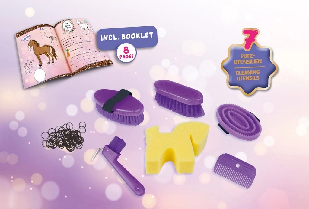S ovim kompletnim setom djeca će doživjeti radost prave brige o svom konjiću. Sav pribor je pohranjen u praktičnoj kutiji s ručkom, tako da ga mogu imati pri ruci kod kuće i u štali. Zahvaljujući ergonomskom dizajnu alati dobro leže u ruci, a rad je udoban i siguran.