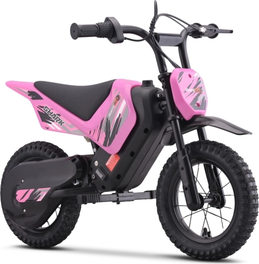Stilski dječji električni motor SHARK u ružičastoj boji nudi sigurnu zabavu u dvorištu i na uređenim putevima. Ima čvrst okvir s plastificiranim premazom, pneumatske terenske gume s dubokim profilom i maksimalnu brzinu do 15 km/h. Pogon osigurava tihi elektromotor od 150 W s lančanim prijenosom, na raspolaganju su 2 brzinska moda i praktičan pokazivač stanja baterije.