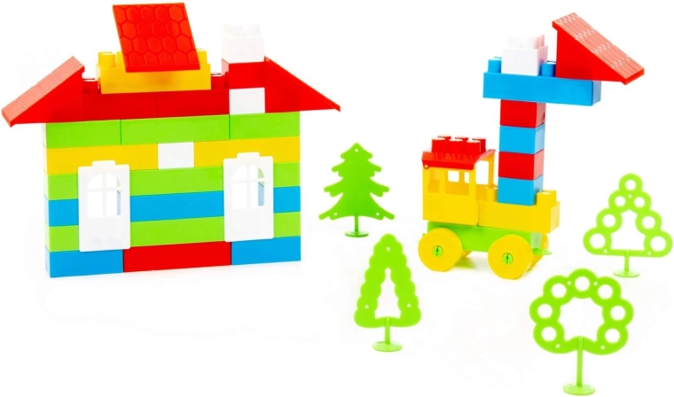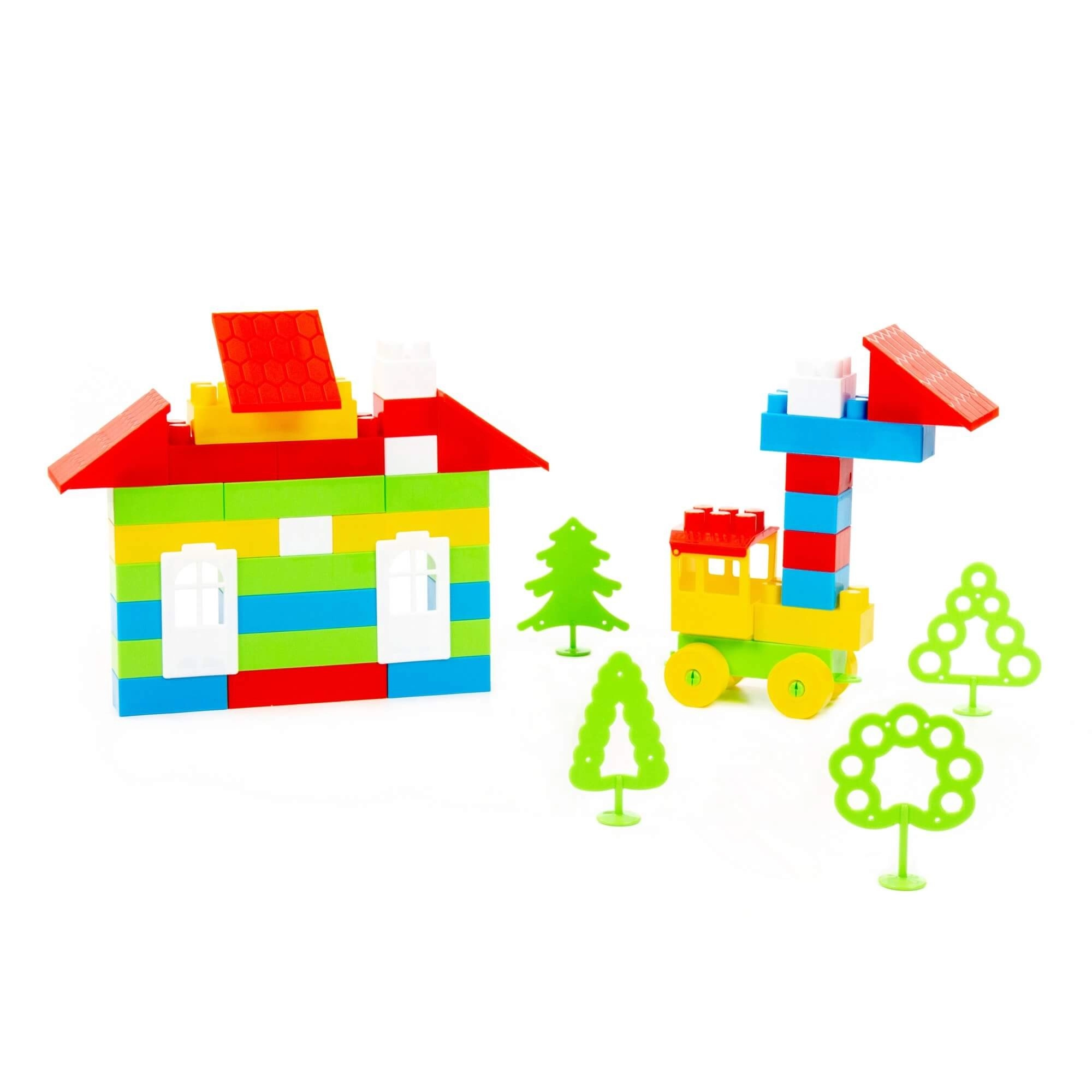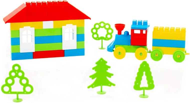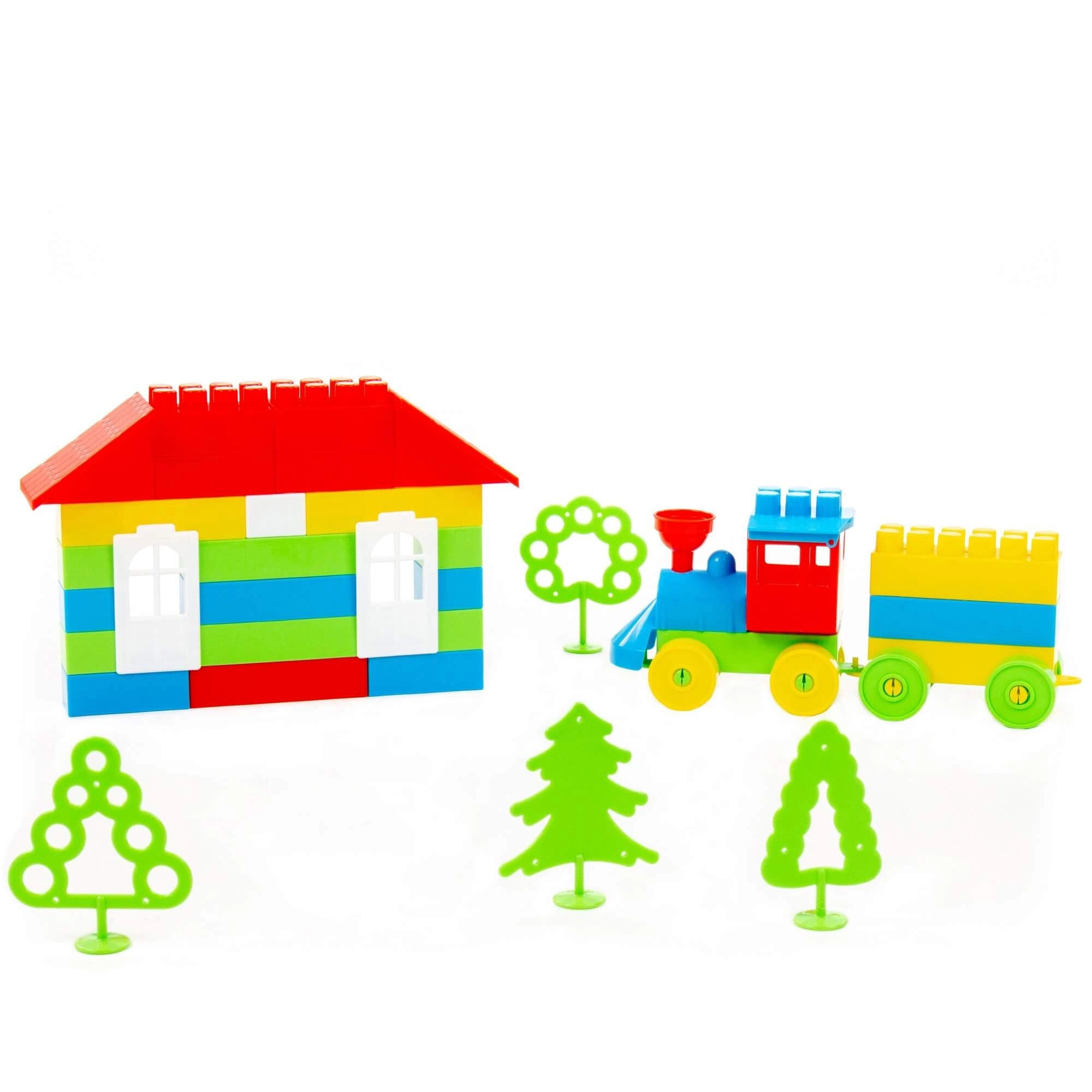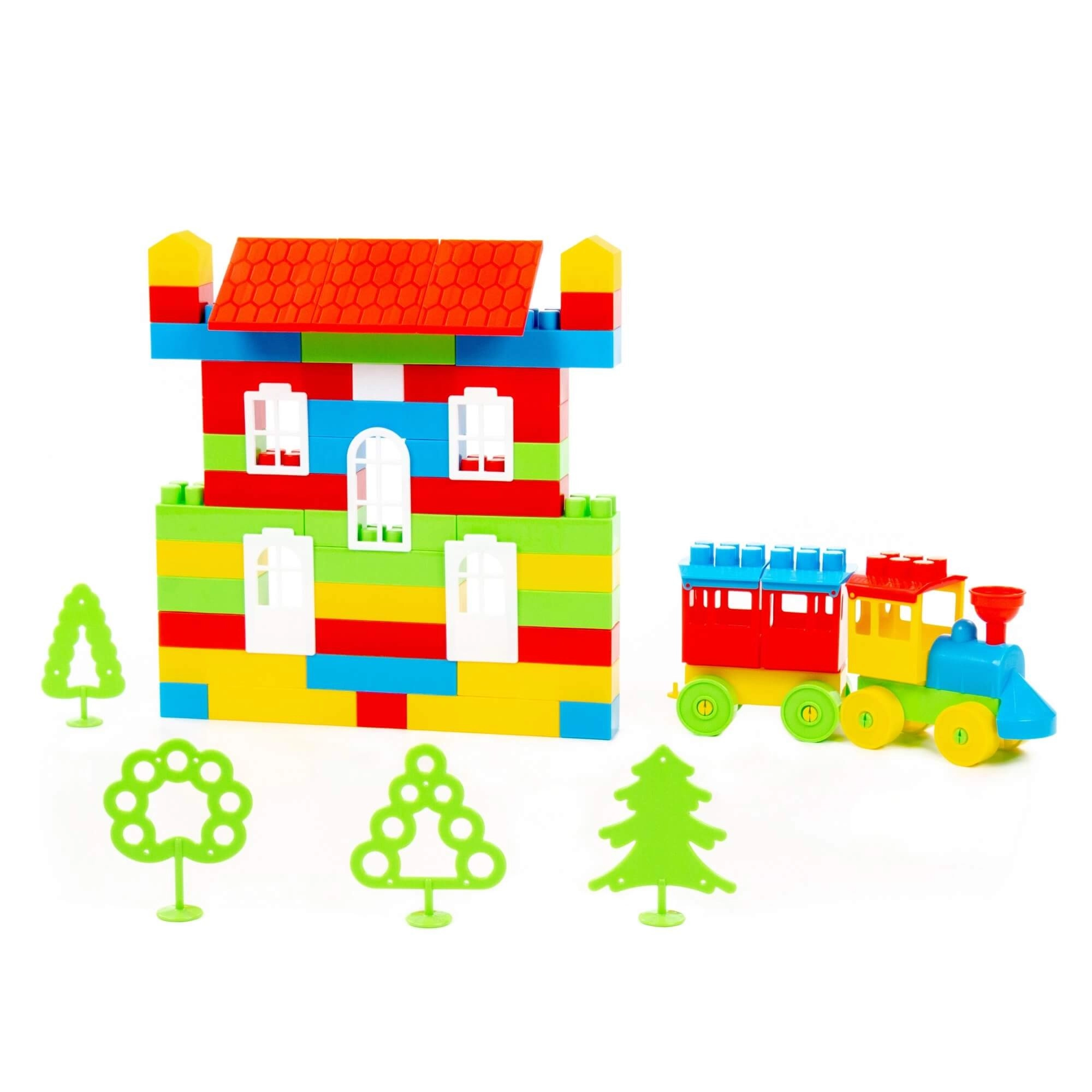 Izgradite dvoetažnu kuću s krovom, prozorima i upotpunite scenu vlakićem i stablima za još zabavniju igru.