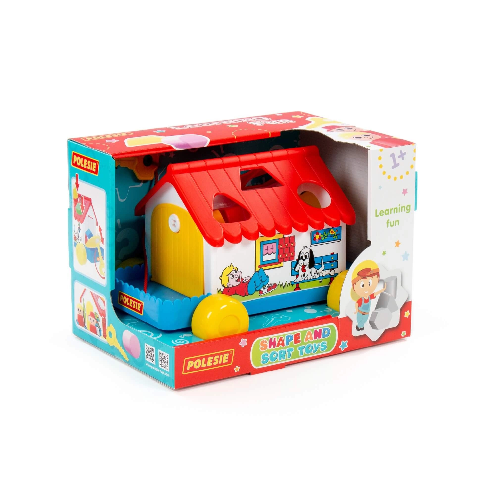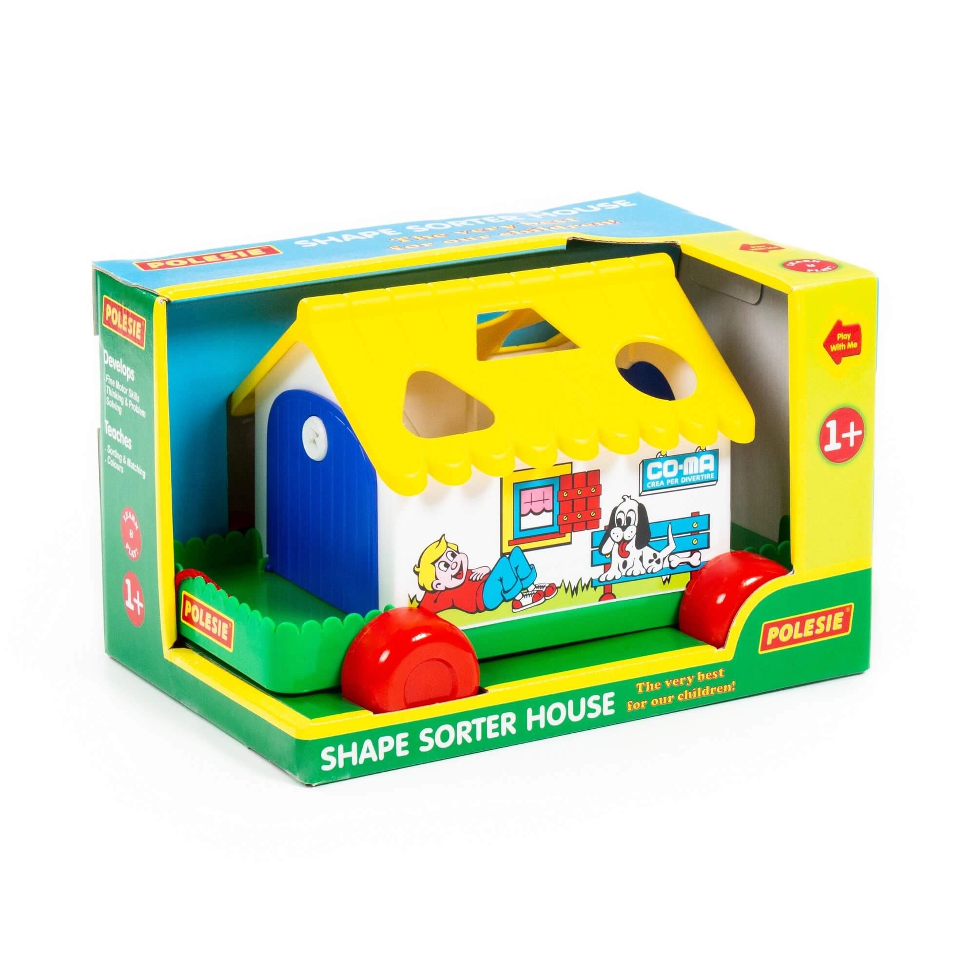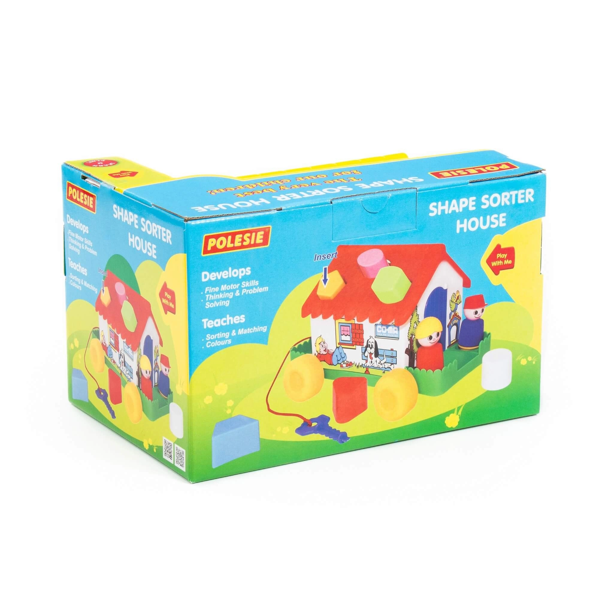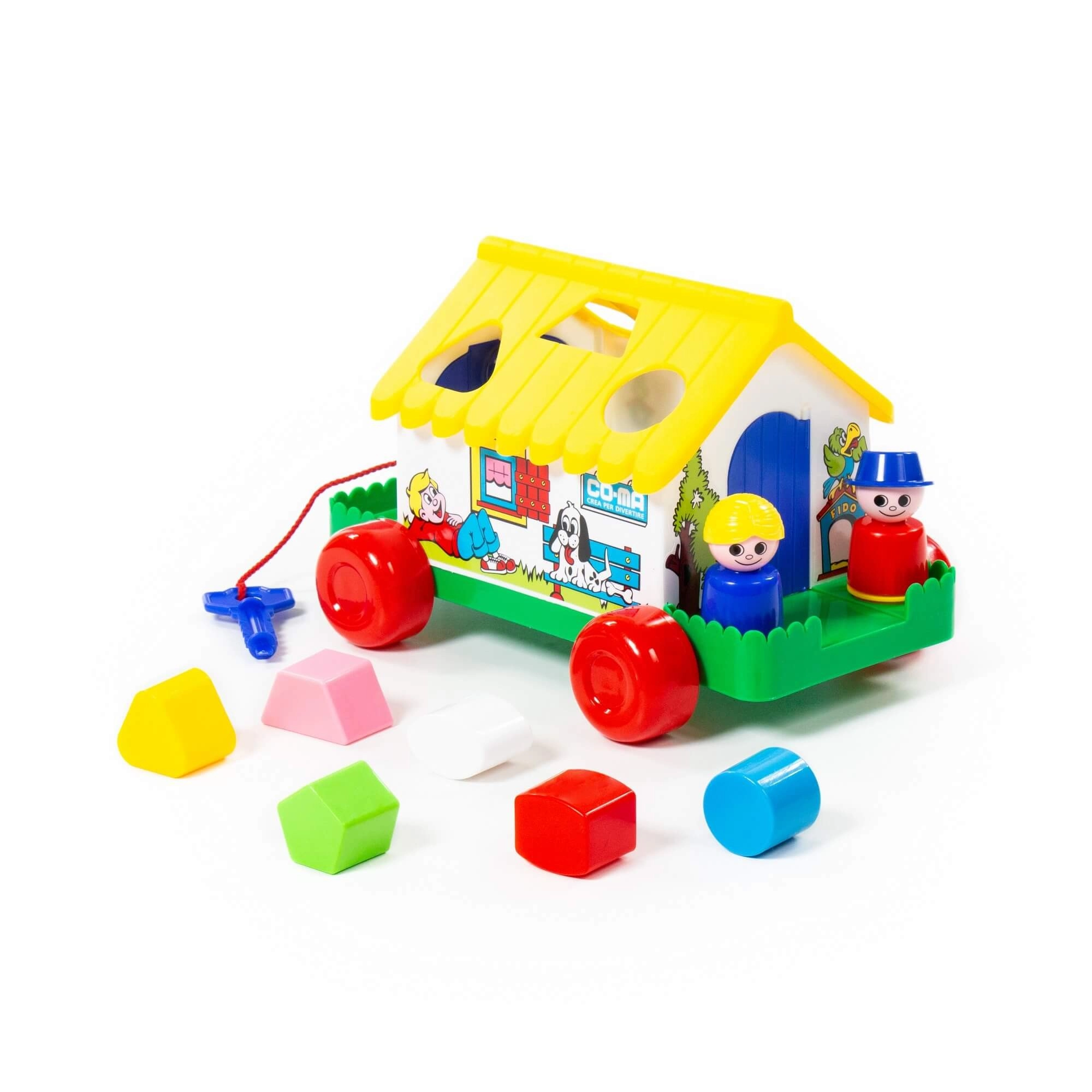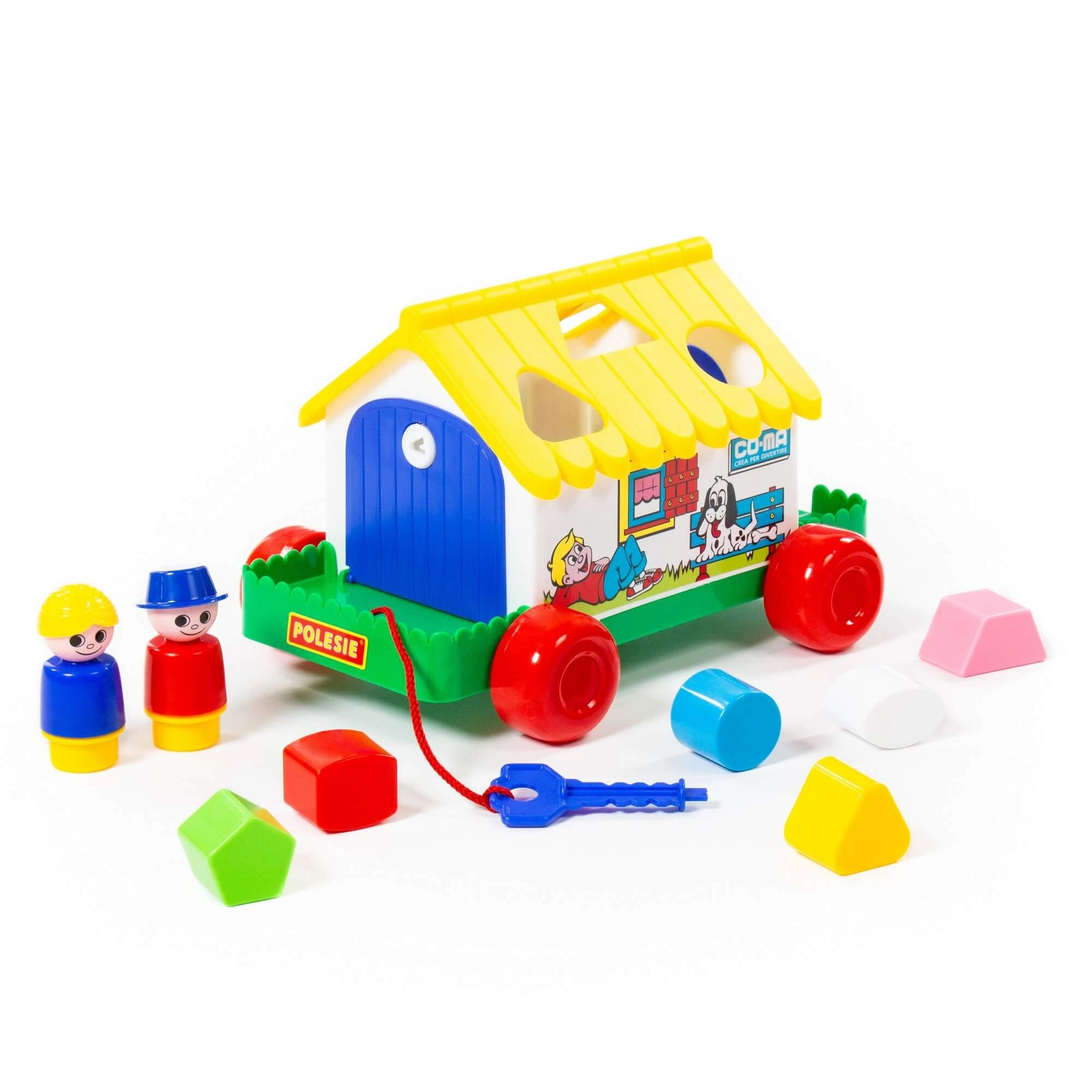 Multifunkcionalna didaktička kućica na kotačićima spaja umetanje oblika, razvrstavanje oblika i vučnu igračku u jednom. Djeca vježbaju logičko razmišljanje, finu motoriku i prepoznavanje oblika zahvaljujući 6 različitih dijelova. Kućica ima otvarajuća vratašca (jedna na ključ) i sadrži 2 figurice za još zabavniju igru. Zahvaljujući kotačićima i uzici djeca je mogu lako vući za sobom. Dostupno u nekoliko varijanti. Cijena za 1 komad.