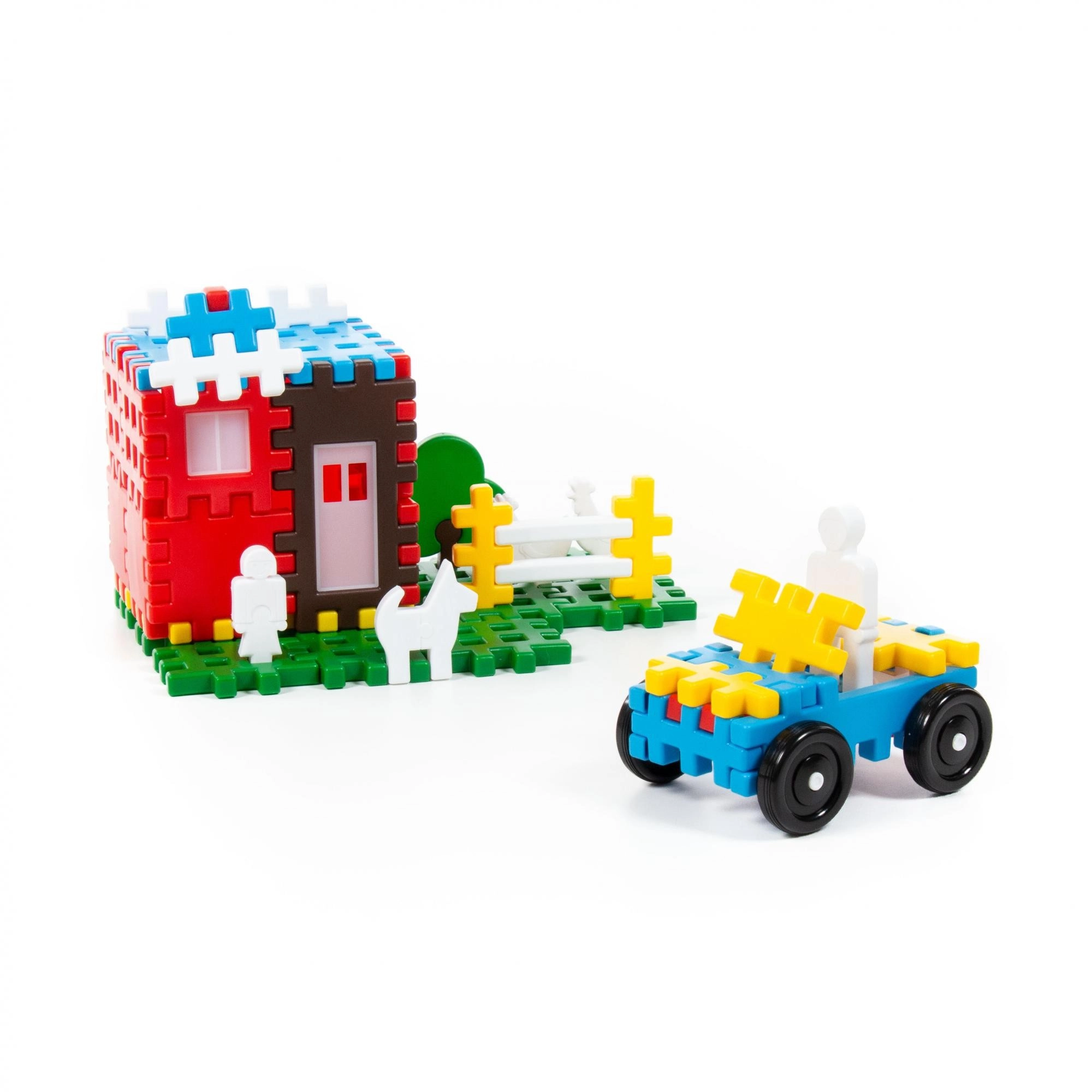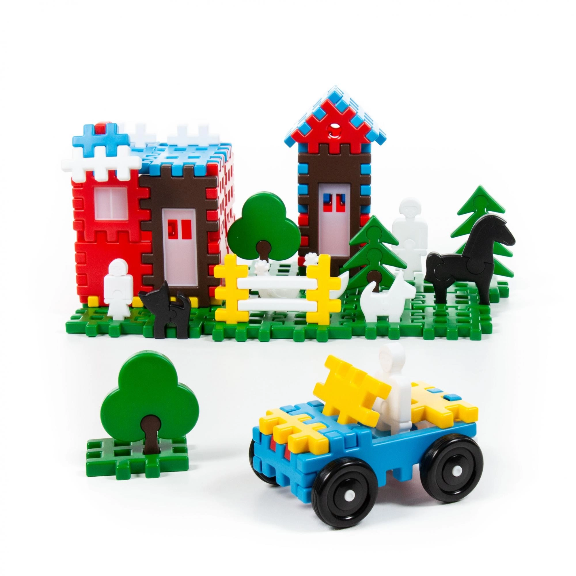 Set uključuje dijelove za izradu kućica, ograda, drvaca i funkcionalnog autića s kotačima – idealno za razvoj maštovite igre.