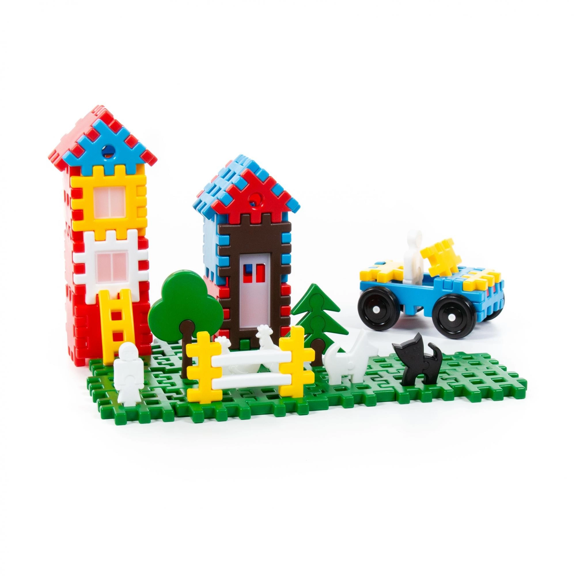 Dvije građevine, figurice, životinjice i dodatni elementi omogućuju stvaranje slikovite scene. Djeca uvježbavaju logiku i suradnju tijekom zajedničke izgradnje.