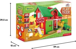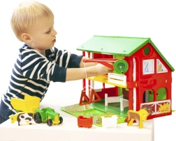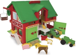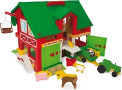 Set za igru Play House farma prenosi djecu u realistčno okruženje seoskog imanja. Dvokatna kućica visine oko 37 cm nudi mnogo interaktivnih elemenata: vrata koja se otvaraju, lift, dizalicu i rampe. U setu su također traktor s prikolicom, figurice domaćih životinja (konj, pijetao, kokoš, krava, prase, ovca) i naljepnice za dodatne detalje.