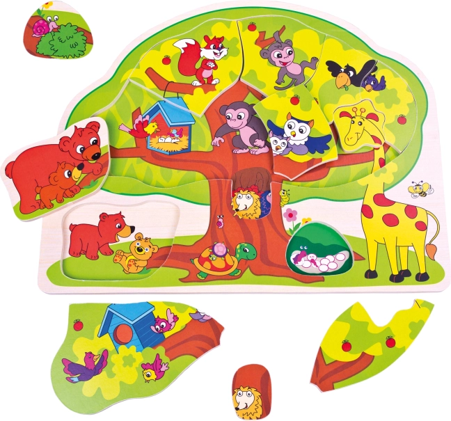 Slagalica je u obliku stabla i sadrži 11 zasebnih dijelova sa životinjicama te čvrstu podlogu. Zahvaljujući izdržljivoj šperploči idealna je za svakodnevnu upotrebu kod kuće i u vrtiću.