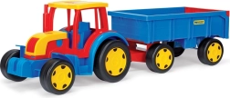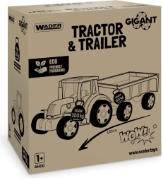 Naš veliki traktor iz linije Gigant opremljen je prikolicom s otvarajućom stražnjom klapnom. Ova vozila idealna su igračka za djecu, bilo za gradnju, utovar ili premještanje materijala. Pokretna žlica traktora služi kao buldožer ili utovarivač, što igru čini još zabavnijom. Prednosti ovog traktora su kvalitetna izrada, izdržljivost i nosivost konstrukcije - traktor nosi do 100 kg, a prikolica 60 kg.