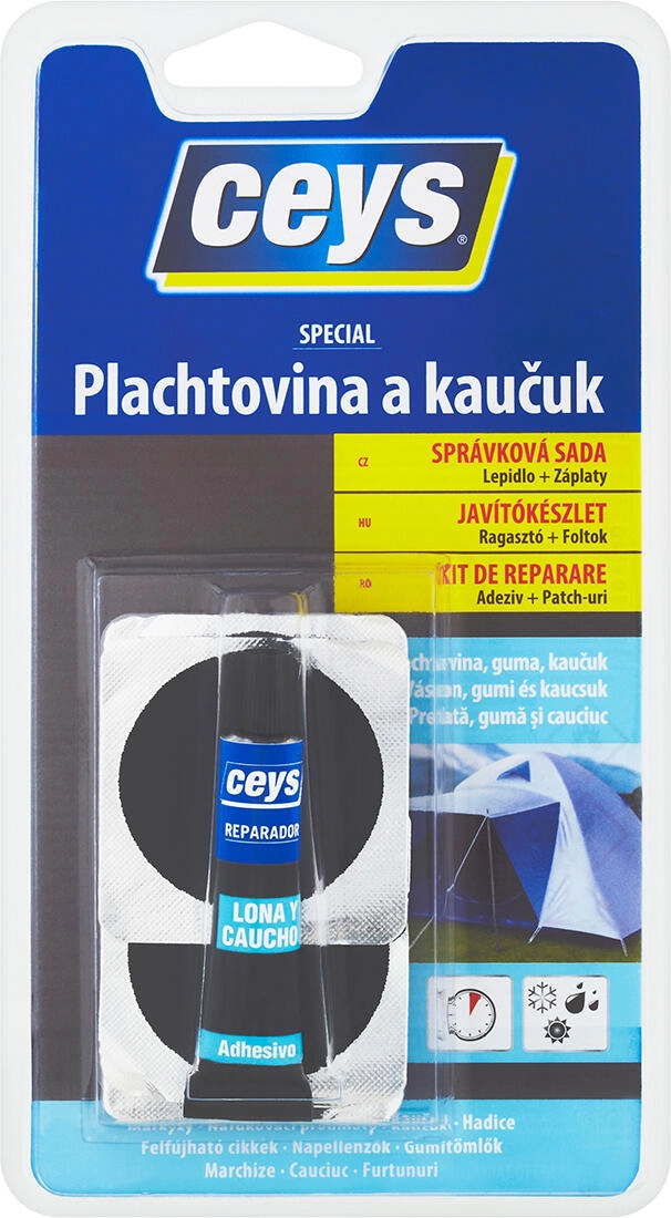 Praktičan set CEYS za brze popravke cerada i gumenih materijala. Trenutačno lijepi i brtvi male pukotine i rupice, jednostavna primjena i pouzdana otpornost u temperaturnom rasponu od -10 do +75 °C. Idealno za gumu, kaučuk, neopren i ceradu.