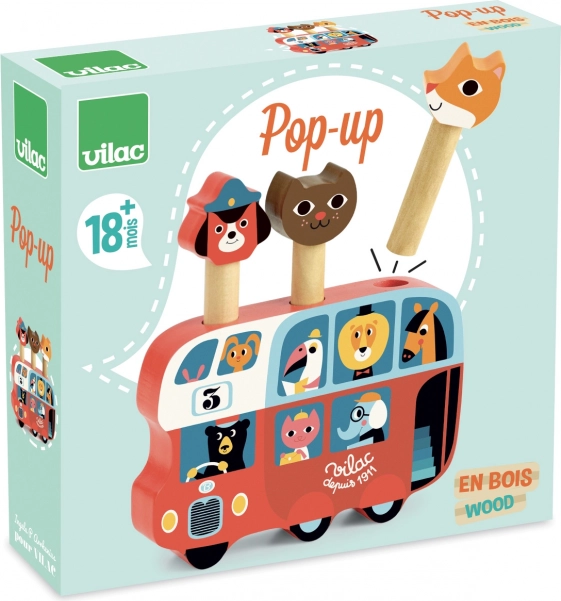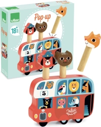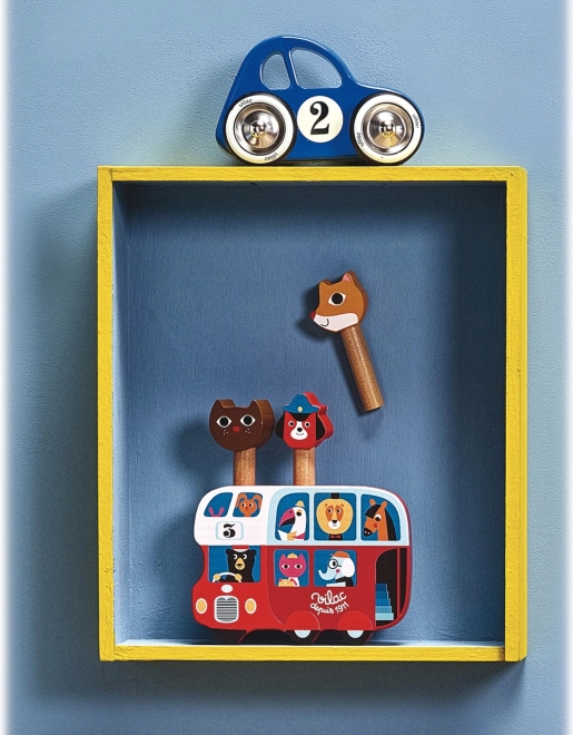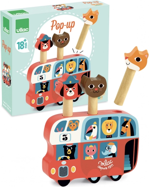 Vilac Drvena igra lansiranja Autobus sa životinjama je prekrasna igračka s ilustracijama poznate umjetnice Ingele P. Arrhenius. Tri šarmantna lika – lisica, pas i mačka – iskoče iz autobusa, što će djecu zasigurno zabaviti.