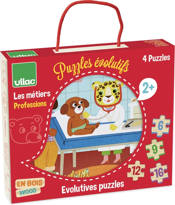 Ovaj set sadrži četiri razvojne puzzle s motivima različitih zanimanja, osmišljene tako da djecu potiču na postupno napredovanje. Zahvaljujući različitom broju dijelova, male ručice usvajaju pravilne tehnike slaganja i uče prepoznavati oblike i boje.
