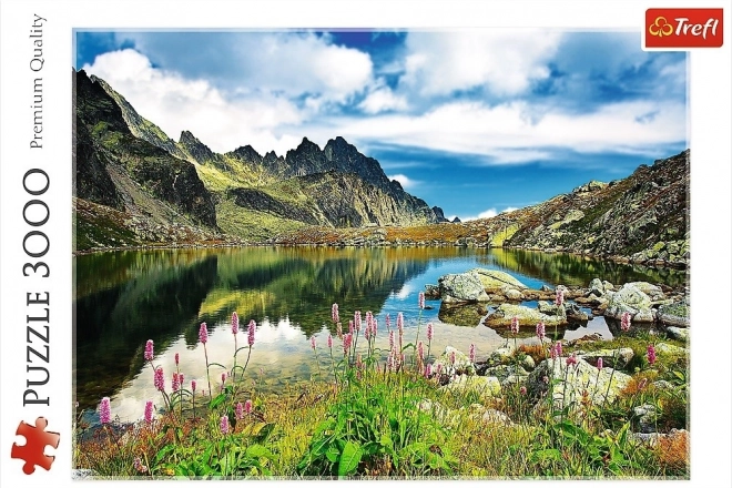 Prikazuje mirno Starolesniansko jezero s odrazom tatranskih vrhova, cvijeće u prvom planu i kristalno čistu vodu.