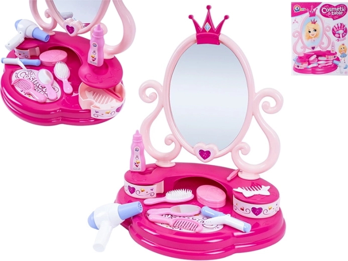 Dio pakiranja je 9 praktičnih dodataka: češalj, četka, zrcalo, pinceta, ukosnica-češalj, uvijač, pudrer, fen i tuba s kremom. Stolić ima dvoje malih ladica za pohranu sitnica i izrađen je od izdržljive i sigurne bezmirisne plastike, što osigurava dugi vijek trajanja i ugodno korištenje.