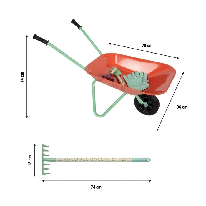 Ovaj kompletni dječji vrtni set potiče male vrtlare na kretanje i kreativnost. Uključuje praktična kolica za prijevoz zemlje ili lišća te osnovne alate za grabljenje i premještanje materijala. Zahvaljujući čvrstoj izradi i prilagođenoj veličini, djeca sigurno i zabavno usvajaju radne navike.