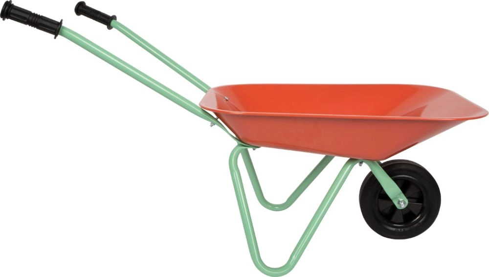 Stabilna metalna korpa, izdržljiv okvir i ergonomične ručke omogućuju djeci udobno prevoziti zemlju, lišće ili alat po vrtu.