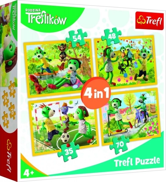 Razveselite djecu šarenim setom 4 neovisne slagalice s motivima omiljenog serijala Obitelj Treflik. Svaka slika ima različit broj dijelova, pa će uživati i početnici i malo napredniji slagatelji. Zahvaljujući posebnom papiru koji odbijа svjetlo, dijelovi se lakše razlikuju i slaganje je ugodnije.