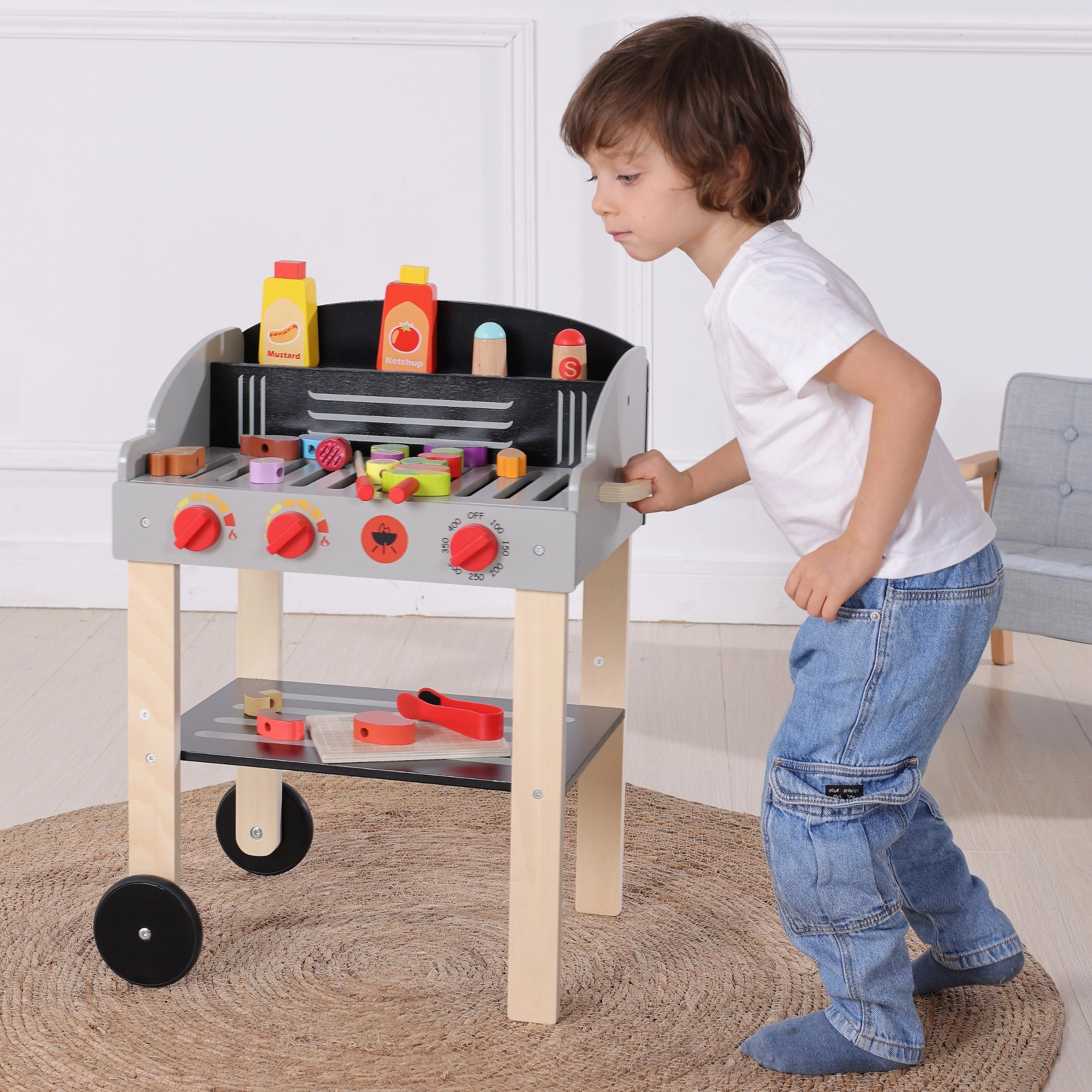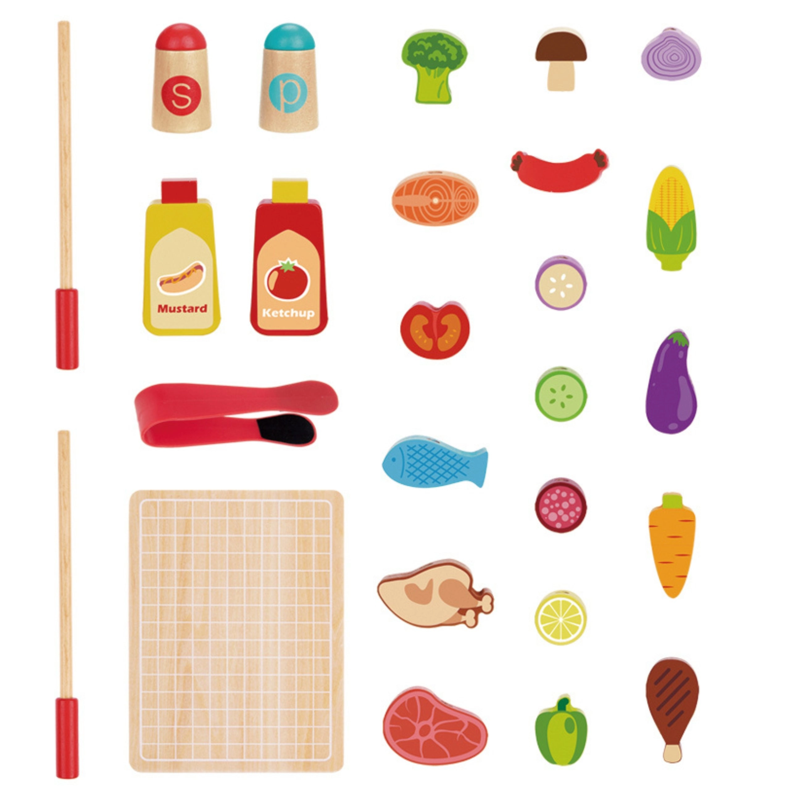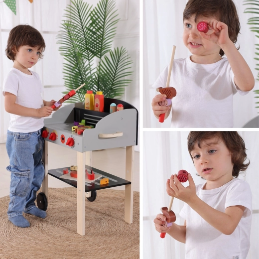 Realistični gumbi koji klikaju i poklopac koji se otvara donose autentičan doživljaj roštiljanja. Dva ražnjića djeca slažu od drvenih komadića “mesa”, povrća i gljiva, sve nadopune začinima i umacima te okreću pomoću roštilj kliješta. Set potiče maštu, igranje uloga i suradnju s prijateljima.