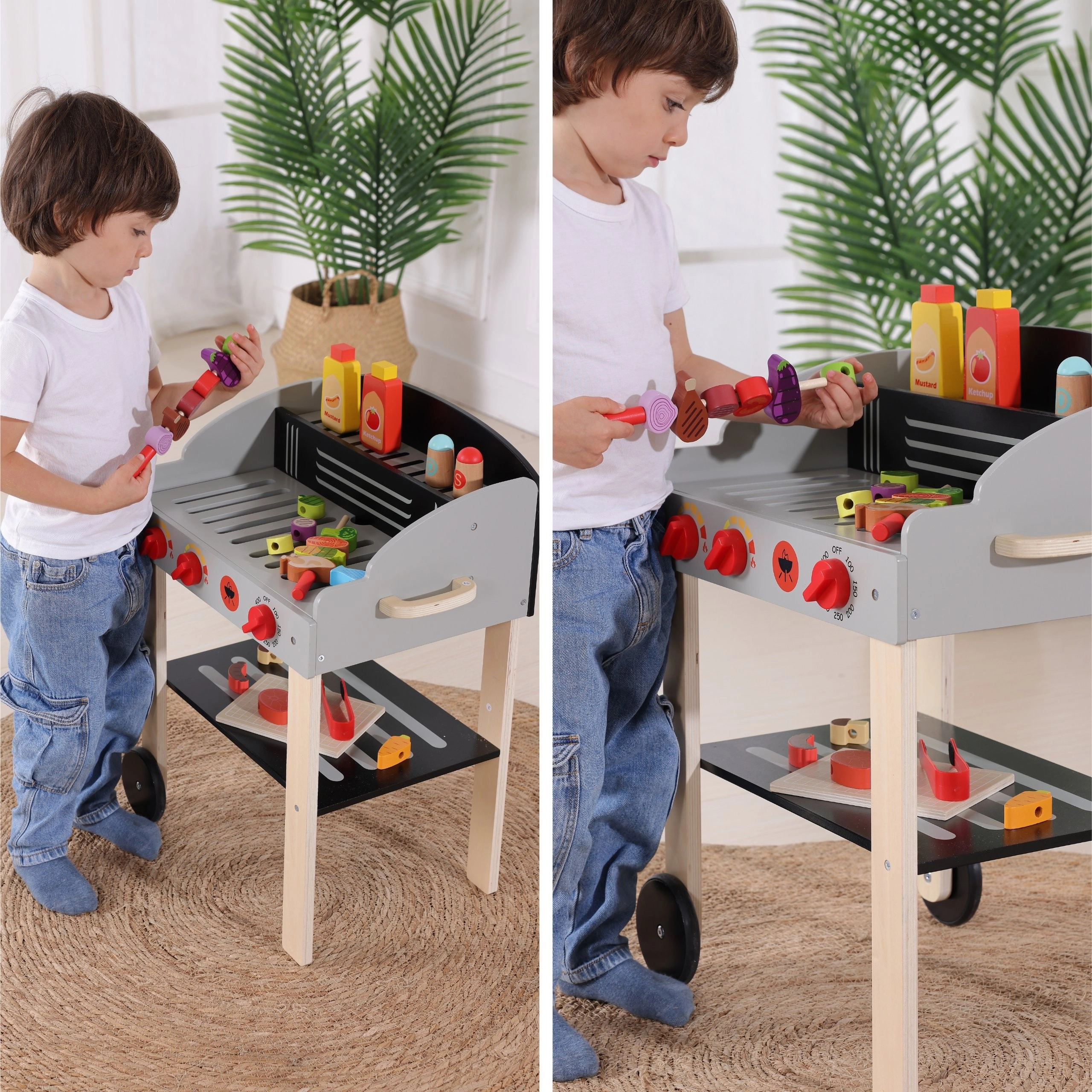 Otkrijte radost igre kuhara s prekrasnim drvenim roštiljem WOOPIE na kotačićima. Ovaj kvalitetan set od čvrstog drva s okretnim gumbima, poklopcem koji se otvara i donjom policom oduševit će djecu od 3 godine. Bogat set dodataka uključujući ražnjiće, povrće i meso, kečap i senf, soljenku i paprenku te kliješta potiče kreativnu igru, razvoj fine motorike i sigurno upoznavanje s pripremom jela.