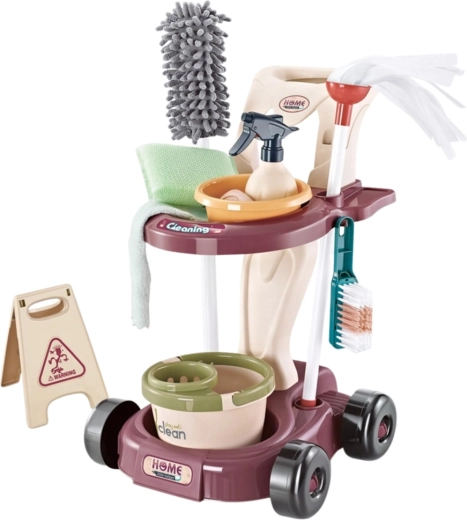 kolica za čišćenje, kanta, mop, mala četka, krpice, raspršivač, metlica i lopatica, velika četka i lopatica, dječji usisavač, zdjelica, vješalica za pribor, upozoravajuća tabla
