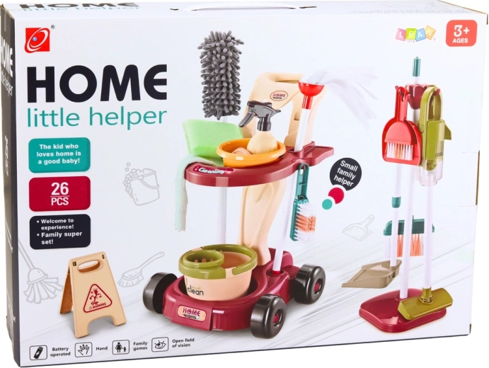 • 26 elemenata za raznoliku igru: kolica, kanta s mopom, usisavač, četke, metlice, vezice, krpice i drugo.