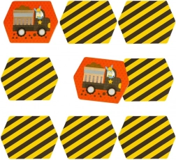 Heksagonalne karte ističu se jasnom narančastom pozadinom i životinjama na građevinskim strojevima, koje povećavaju djetetov interes za učenje i istraživanje.
