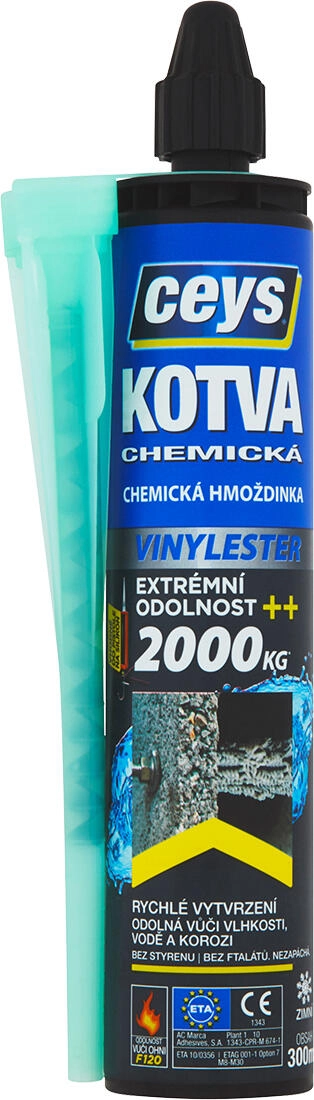 Kemijsko sidro CEYS Vinilester 300 ml profesionalno je rješenje za pouzdano sidrenje vijaka, klinova, navojnih šipki i čeličnih konstrukcija u širok raspon materijala. Zahvaljujući vinilesterskoj formuli nudi iznimnu čvrstoću, brzo očvršćivanje i otpornost na visoke temperature i koroziju. Ne širi se, stoga je idealno za sidrenje na mjestima s rizikom od pucanja podloge.