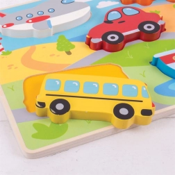 Zabavna drvena slagalica s umetanjima s prometnim sredstvima za najmlađe. Sadrži 5 velikih dijelova s ručkicom koje djeca lako umeću u odgovarajuće otvore. Podupire finu motoriku, koordinacijske vještine, učenje oblika i boja te razvoj rječnika. Izrađeno od kvalitetnog drva i udovoljava europskim sigurnosnim normama.