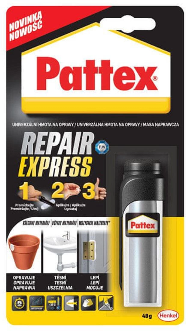 Univerzalna epoksidna reparacijska masa PATTEX Repair Express idealna je za brze i trajne popravke u kućanstvu. Prikladna za lijepljenje i obnovu kupaonske i kuhinjske opreme, poput držača za ručnike, ručki, vješalica, posudica za sapun ili držača za mikser. Lako se oblikuje, brzo očvršćuje te je nakon očvršćivanja čvrsta i izdržljiva.