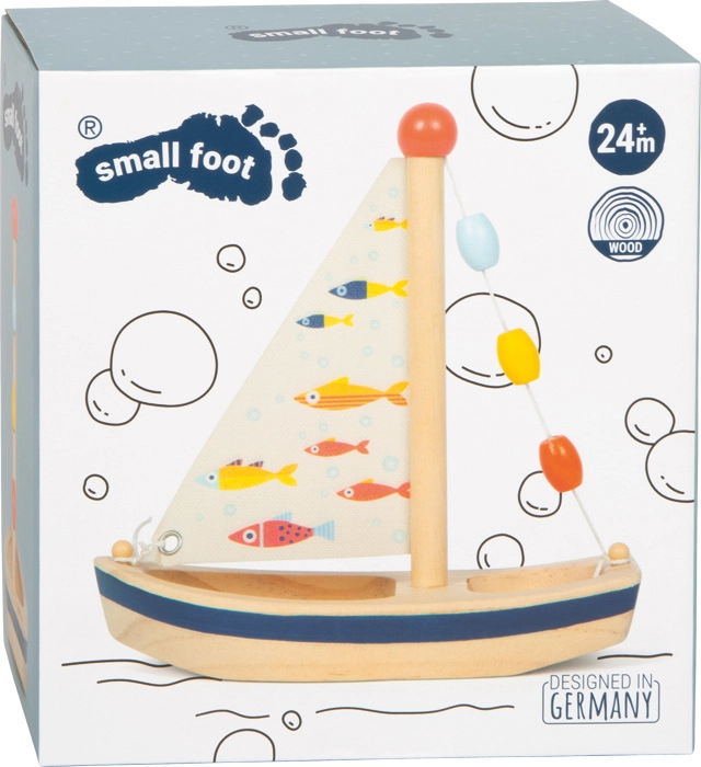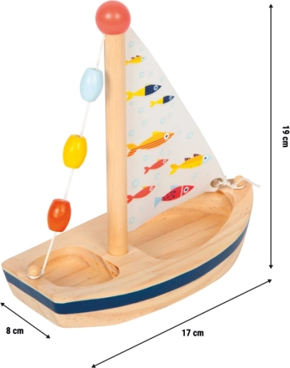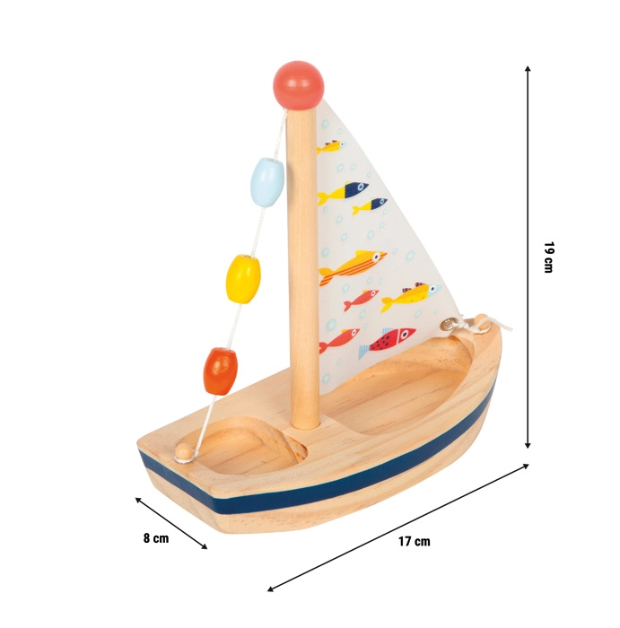 Ova stilska drvena jedrilica unijet će dozu mašte u svako kupanje i ljetne vodene igre. Prirodno drvo nadopunjuje tiskano platneno jedro s veselim ribicama te šarene perlice na jarbolu koje zaokupljaju djecu i potiču osjetilnu percepciju. Igračka je lagana, dobro leži u dječjoj ruci, a nakon vodene zabave dovoljno ju je jednostavno obrisati kako bi bila spremna za novu plovidbu.