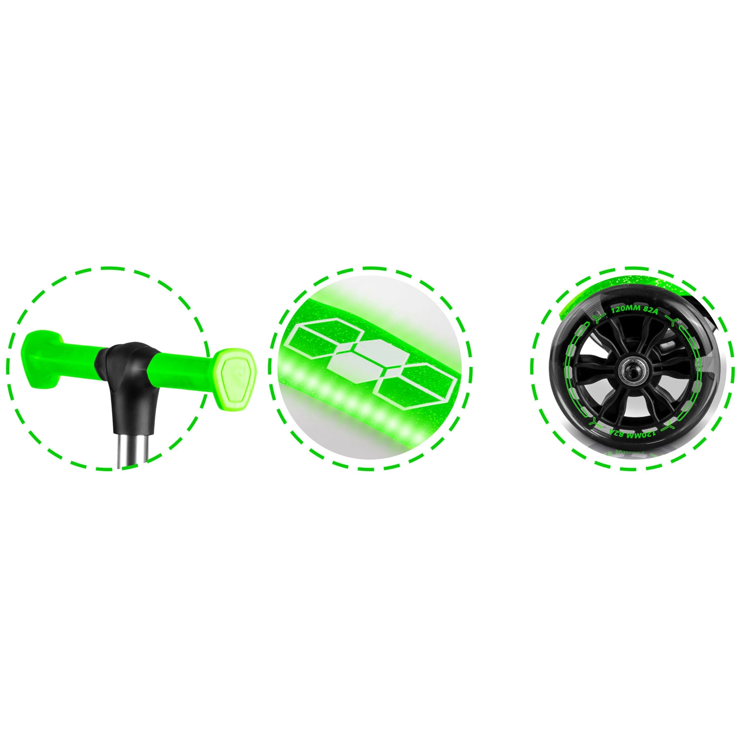 - Vidljivost i zabava: LED prednji kotači i LED podesta bez baterija (dinamo).