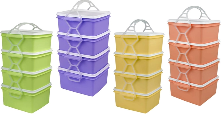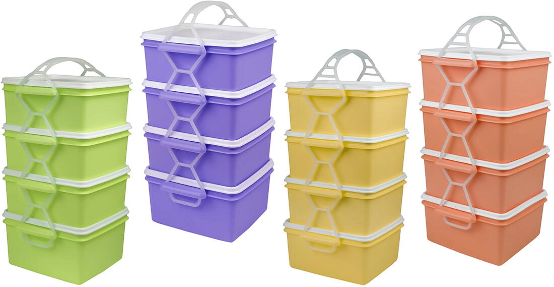 Praktična četvrtasta posuda za nošenje hrane s četiri odvojene posude zapremnine 1,2 l idealna je za svakodnevno prenošenje ručka ili užine. Dijelovi su čvrsto povezani ručkom za udobno nošenje i stabilnost. Velika zapremnina, izdržljiva plastika i mješavina veselih boja čine je izvrsnim izborom za posao, školu i putovanja.