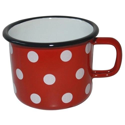 Klasična emajlirana šalica s veselim motivom točkica razveselit će i na vikendici i kod kuće. Zahvaljujući izdržljivom emajlu čvrsta je, lako se održava i prikladna je za perilicu posuđa. Obujam 0,5 l i promjer 9 cm idealni su za kavu, čaj i kakao.