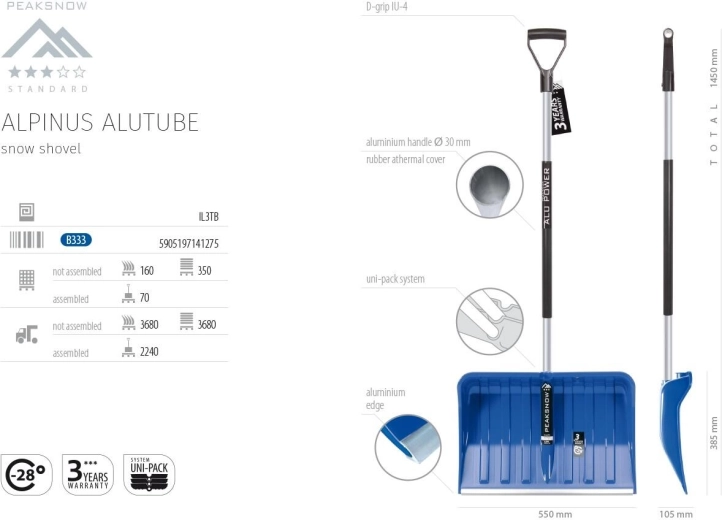 Ova snježna lopata izvrsna je opcija za svakodnevno čišćenje prilaznih putova, nogostupa i dvorišta. Laka, ali izdržljiva plastična lopata i udoban termo držak omogućuju jednostavno rukovanje i po ledenom vremenu. Zahvaljujući ergonomskom dizajnu smanjuje se umor pri radu, a lopata se lako nosi i s očvrsnulim ili prianutim snijegom.