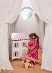 Kućica za lutke Sweetheart Cottage oduševljava detaljima – motivima srca i cvijeća, pastelnim tonovima i promišljenim rasporedom prostorija. Prednji dio se u potpunosti otvara, pa djeca imaju udoban pristup svim prostorijama, a podizanjem dijela krova otkrivaju ugodno potkrovlje.