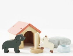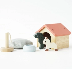Proširite dječji svijet mašte preslatkim setom drvenih ljubimaca – psića i mačkice s kućicom i dodacima. Ovaj kvalitetan dodatak za kućice za lutke i igraće scene potiče socijalnu igru, komunikaciju i maštu. Izrađen od FSC drva, ručno dorađen netoksičnim bojama na bazi vode i osmišljen tako da dugo traje.