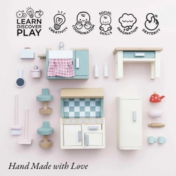 Savršena kuhinja za kućicu za lutke od Le Toy Van. Ovaj prekrasni drveni set sadrži sve što vam treba za minijaturno kulinarsko iskustvo - umivaonik, štednjak, pećnicu, hladnjak i stol sa stolicama. Sve se ručno izrađuje od održivih materijala.