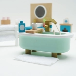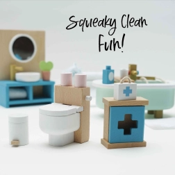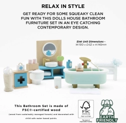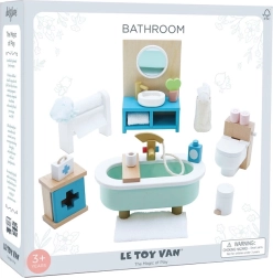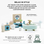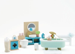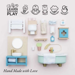 Stilizan set kupaonskog namještaja za kućicu za lutke u mjerilu 1:12 brenda LE TOY VAN. Sadrži kadu, WC školjku, umivaonik, vješalicu za ručnike i ormarić za prvu pomoć, ručno dorađen netoksičnim bojama na bazi vode. Proizvedeno etički od održivih materijala, potiče kreativnu igru, komunikacijske vještine i koordinaciju.