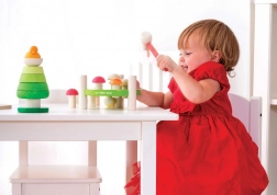 Igračka razvija motoričke vještine time što djeca koriste čekić za zabijanje muharica. Šareni dizajni i oblici potiču vizualnu percepciju.