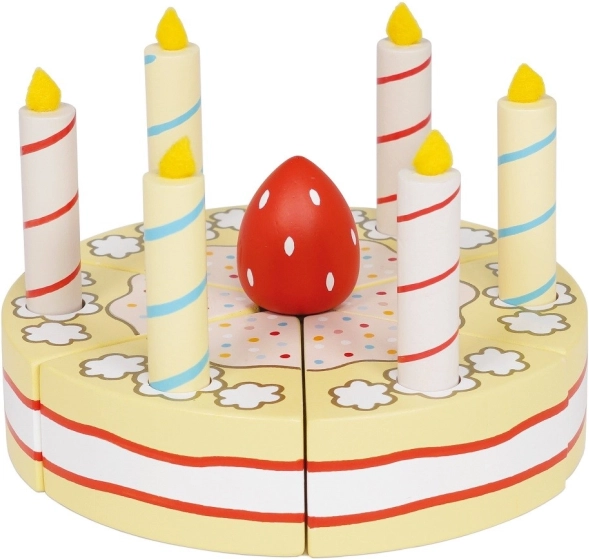 Proslava može početi! Ovaj drveni vanilijin rođendanski tort od LE TOY VAN ima 6 rezanih komada spojenih čičak-trakom i 6 svijeća za realističnu rođendansku igru. Izrađen od FSC drva i obojan netoksičnim bojama na bazi vode, potiče finu motoriku, spretnost i socijalne vještine. Idealna igračka za djecu od 2 godine.