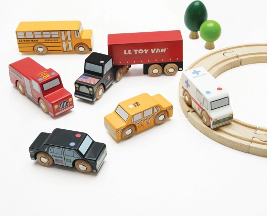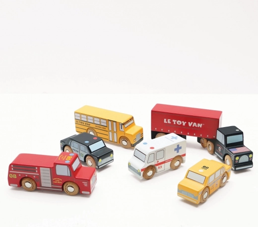 Ova šarena kolekcija sadrži zglobni kamion s deset kotača, žuti školski autobus, policijski automobil, žuti taksi, vozilo hitne pomoći i vatrogasno vozilo. Pažljivo izrađeni detalji i glatko okretni kotači pozivaju djecu na otvorenu igru tijekom koje stvaraju priče i vježbaju koordinaciju ruka–oko.
