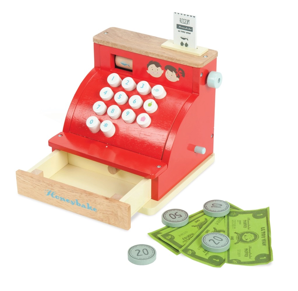 Crvena drvena blagajna LE TOY VAN iz nagrađivane kolekcije Honeybake spaja kvalitetnu izradu, sigurne materijale i očaravajući vintage izgled sa zlatnim detaljima. Idealna je za igru trgovine i razvoj socijalnih vještina, kreativnosti i osnovnih matematičkih vještina.