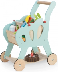 Kolica imaju promišljenu podjelu – dvije gornje pregrade, prostrano dno za veće kupovine, tekstilnu torbu za pakiranje namirnica te praktičnu pločicu za pisanje kredom. Igra potiče igru uloga, razvoj komunikacije, koordinacije oko–ruka i kognitivnih vještina. Pažljiva izrada s naglaskom na etiku i održivost razveselit će djecu i roditelje.