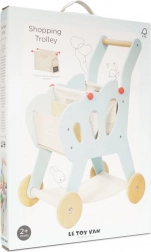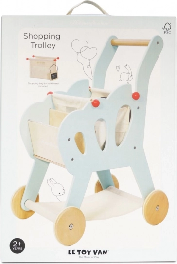 Stilska drvena kupovna kolica LE TOY VAN u pastelnoplavoj boji potiču maštovitu igru, razvijaju finu motoriku i društvene vještine. Nude dvije unutarnje pregrade, donji odlagni prostor, tekstilnu torbu i malu pločicu za popis za kupnju. Izrađena od FSC certificiranog drva, sigurno zaobljena, ručno dorađena netoksičnim bojama na bazi vode.