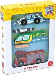 Predstavljamo set spasilačkih vozila od Le Toy Van – savršen poklon za djecu. Ova igračka potiče maštovitu igru pomoću tri spasilačka vozila: helikoptera, policijskog auta i vatrogasnog vozila. Svako je izrađeno od etički održivog kaučukovog drva i obojano netoksičnim bojama na bazi vode, što jamči sigurnost tijekom igre.
