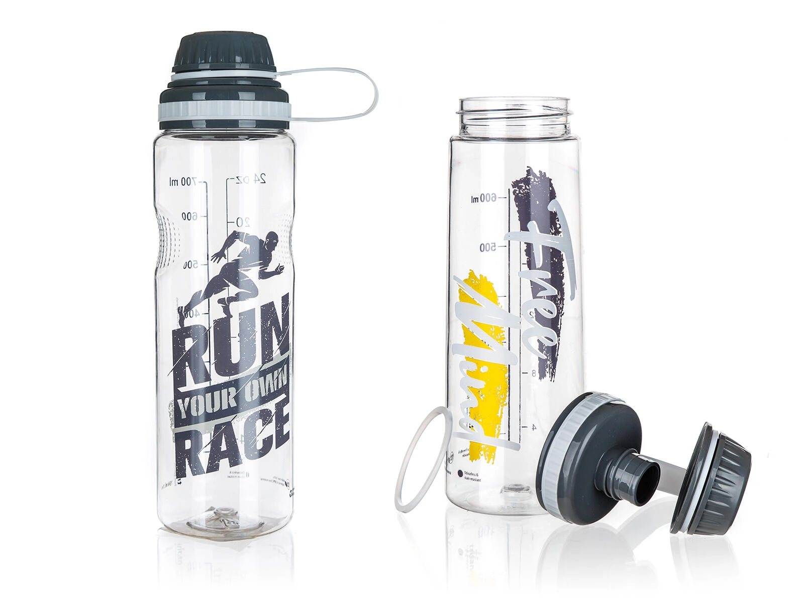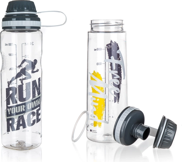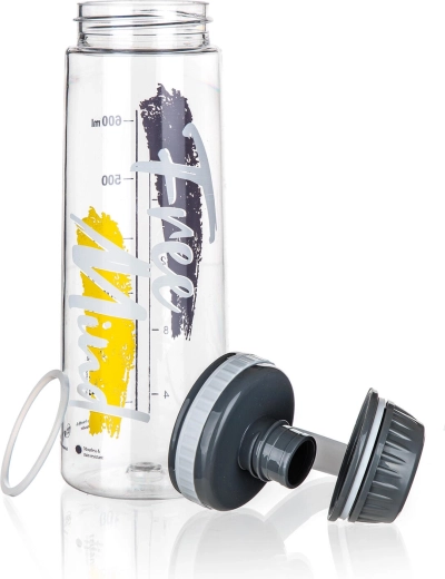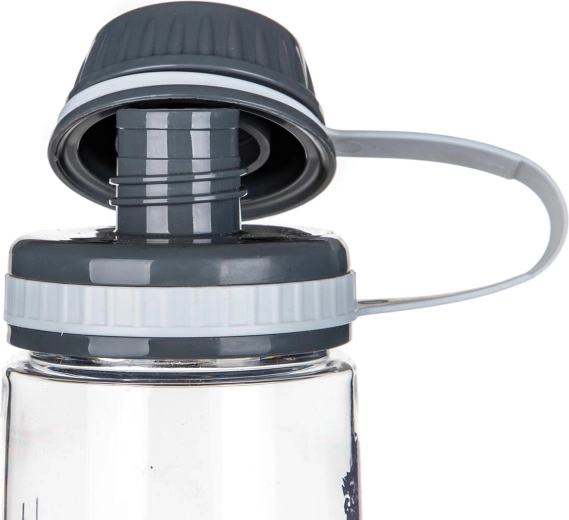 Širok grlić olakšava ulijevanje vode, dodavanje leda i jednostavno čišćenje. Kvalitetna plastična konstrukcija (Tritan + PP poklopac) prikladna je za hladne i tople napitke te ne upija mirise. Minimalistički dizajn sa sivim tiskom pristaje u ured, fitness i na putovanja.