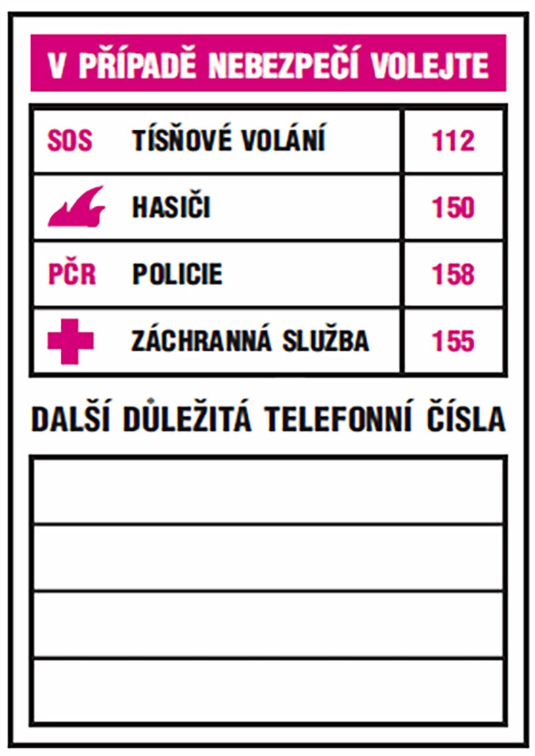 Praktična samoljepljiva tablica s preglednim popisom važnih telefonskih brojeva za brzu pomoć u nuždi. Kompaktan format 74 × 105 mm stane na vrata, hladnjak ili oglasnu ploču, a samoljepljivi sloj osigurava jednostavnu i čvrstu instalaciju.