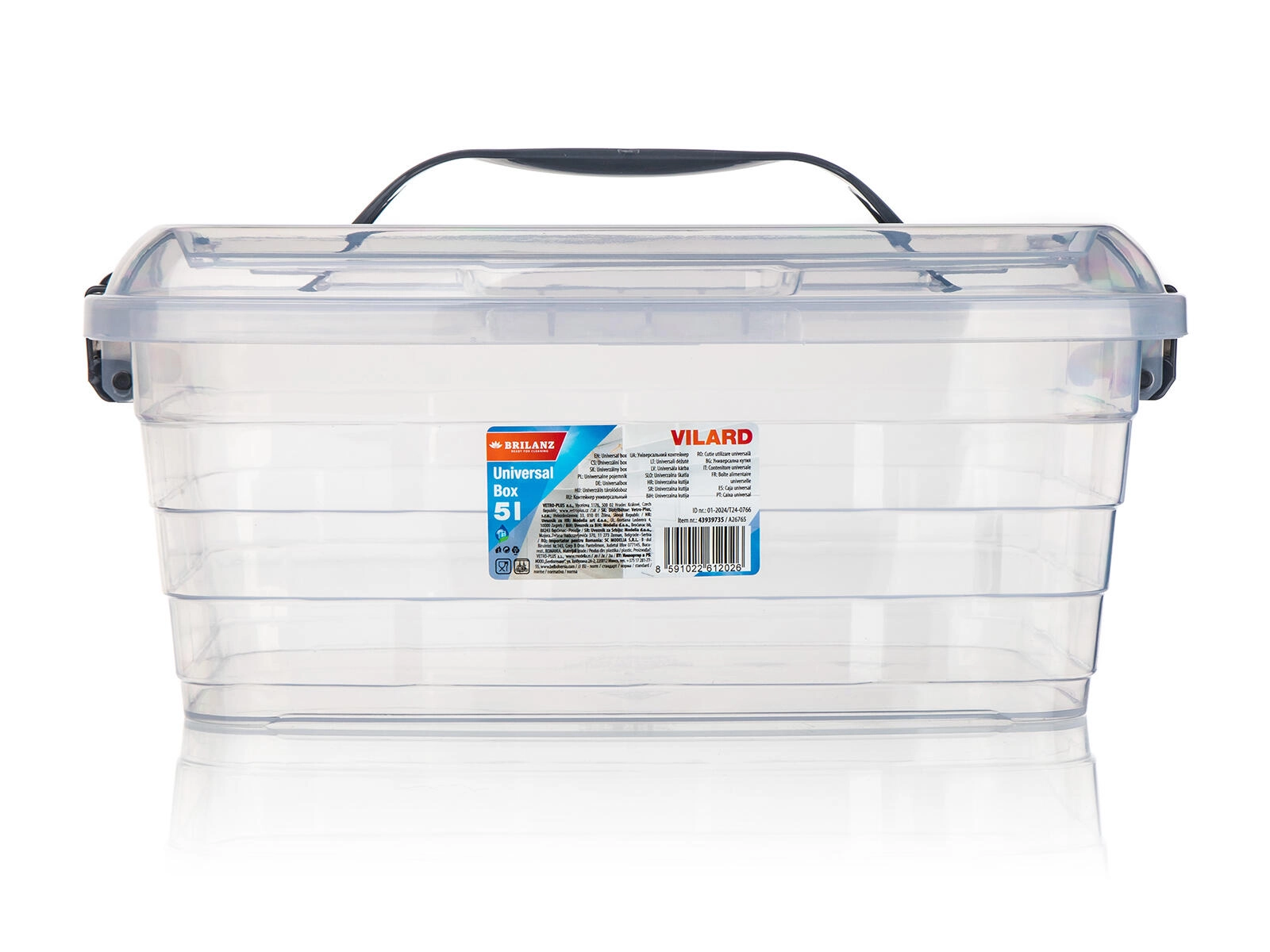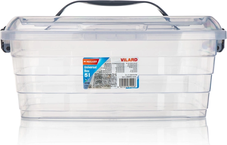 Praktični spremnik VILARD zapremnine 5 l idealan je za kućanstvo, ured i radionicu. Zahvaljujući prozirnom tijelu uvijek imate sadržaj pod kontrolom, sigurne bočne kopče pouzdano zatvaraju poklopac, a čvrsta ručka olakšava prenošenje. Kompaktne dimenzije 29 × 22 × 13 cm omogućuju jednostavno odlaganje na police i u regale.