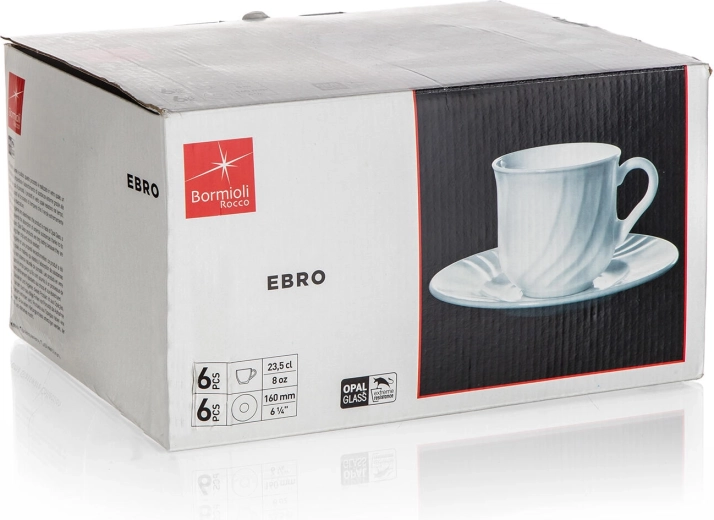 Otkrijte čist dizajn i praktičnost sa setom EBRO od 6 dijelova, izrađenim od bijelog kaljenog stakla. Svaka šalica s tanjurićem dizajnirana je za udobno posluživanje toplih napitaka i jednostavno održavanje. Neporozna površina sprječava nakupljanje nečistoća, dulje zadržava toplinu napitaka i izvrsno izgleda na svakom stolu.