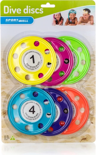 Zabavni i sigurni ronilački diskovi za vodu marke SPORTWELL u praktičnom pakiranju od 6 komada izvrsna su opcija za učenje plivanja i vodene igre. Šareni miks (žuta, narančasta, ružičasta, plava, tamnoplava, zelena) pomaže djeci da lako prepoznaju diskove pod vodom i potiče ih na kretanje. Pogodno za djecu od 3 godine.