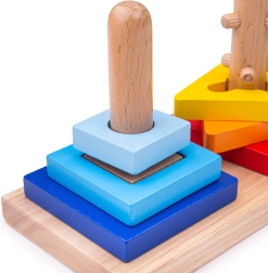 Ova pametna drvena igračka motivira djecu na otkrivanje. Dijelovi se stavljaju na tri različita kolčića, pri čemu neki zahtijevaju okretanje ili pravilnu orijentaciju. Djeca tako prirodno vježbaju spretnost prstiju, strpljenje i prostornu predodžbu.