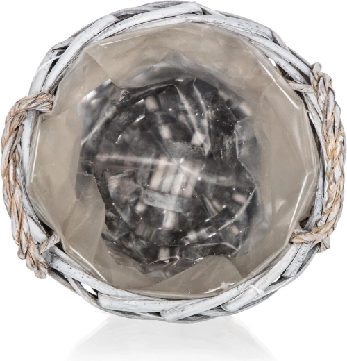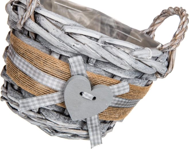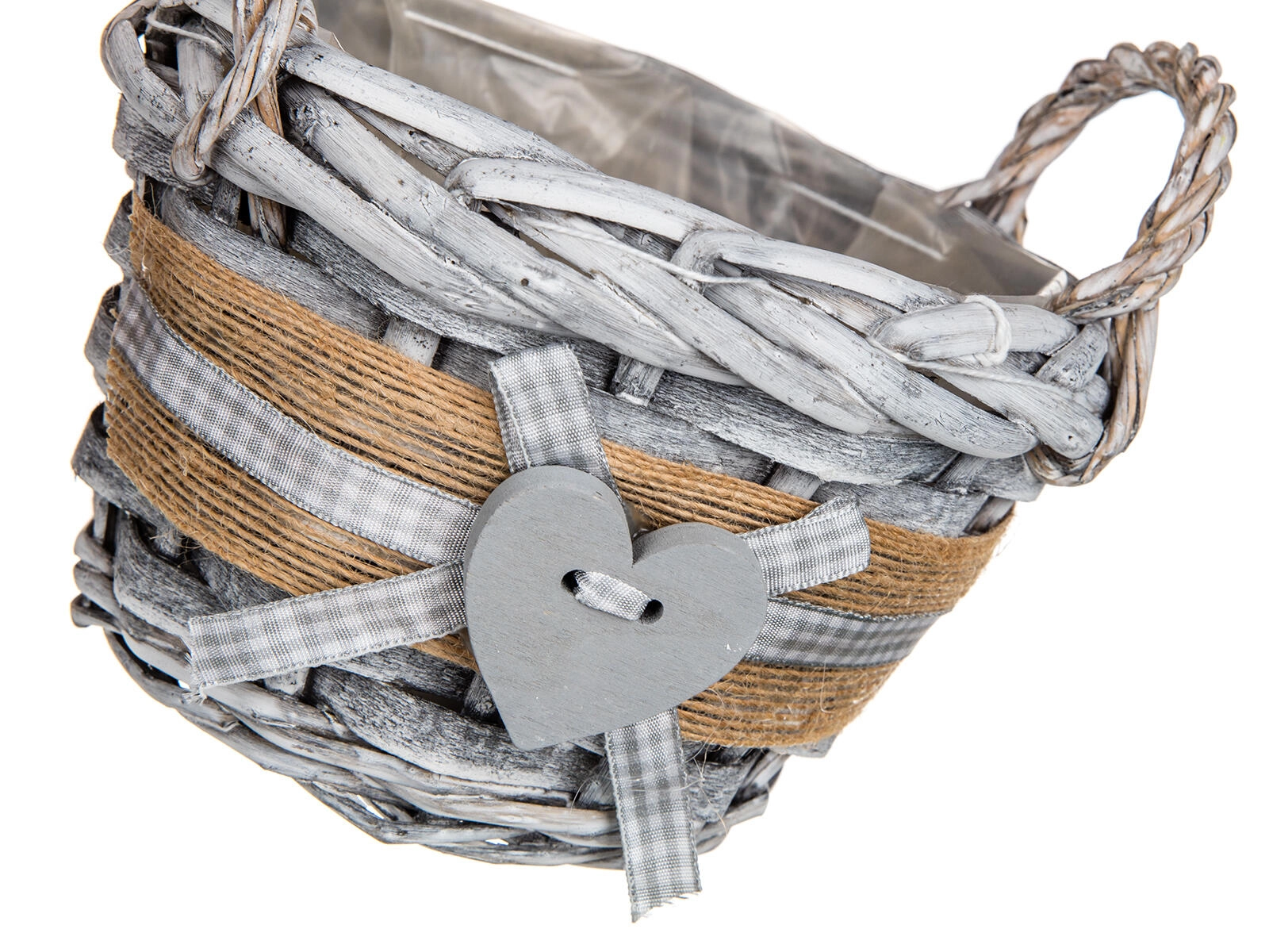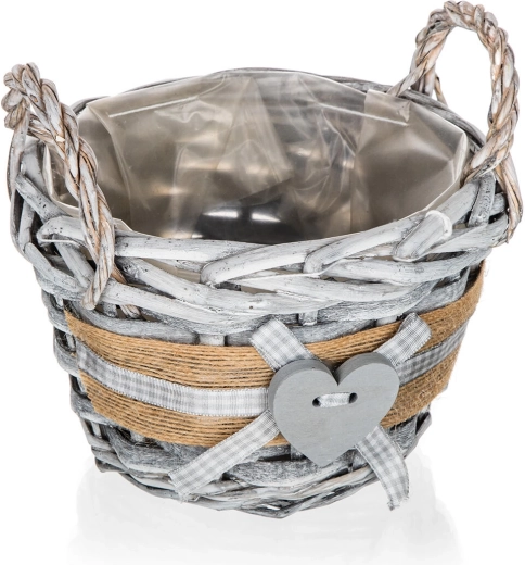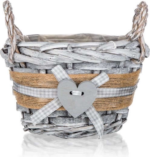 Ova okrugla pletena košarica GRIS unosi u interijer ugodnu, prirodnu atmosferu. Sivo patinirano izdanje s jutastim remenom, kariranom vrpcom i dekorativnim srcem čini je stilskim dodatkom za dnevni boravak, hodnik i kuhinju. Unutarnja plastična umetka štiti površinu i omogućuje sigurno aranžiranje dekoracija bez rizika od vlage.