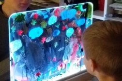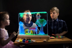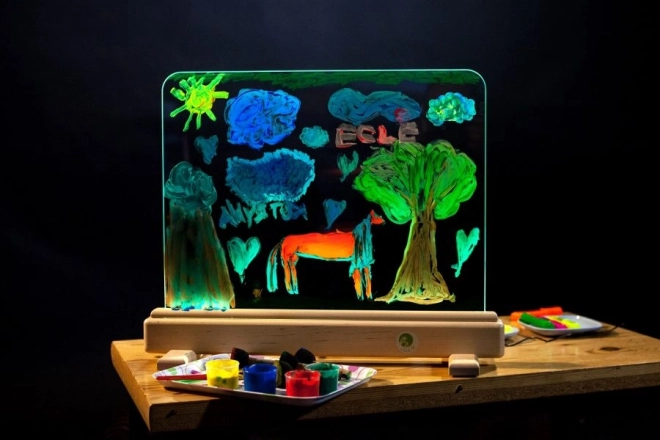 Izdržljiva ploča od kaljenog stakla podnosi dječje oduševljenje i omogućuje slikanje vodenim bojama, prstima i perivim flomasterima. Crtati se može s obje strane, pa se djeca mogu izmjenjivati ili stvarati zajedno.
