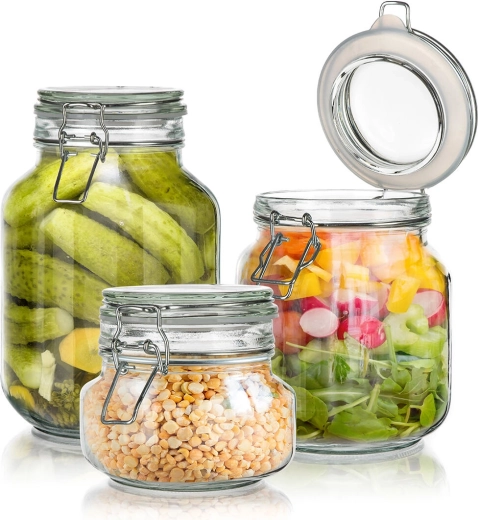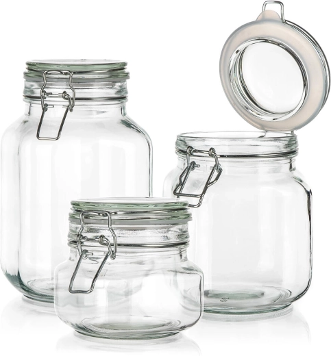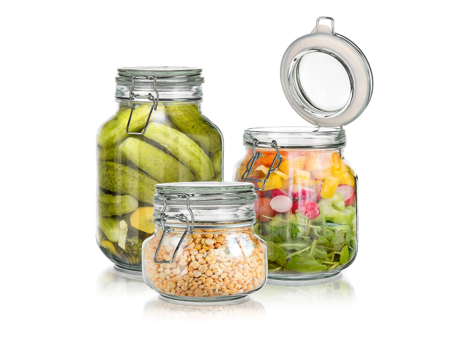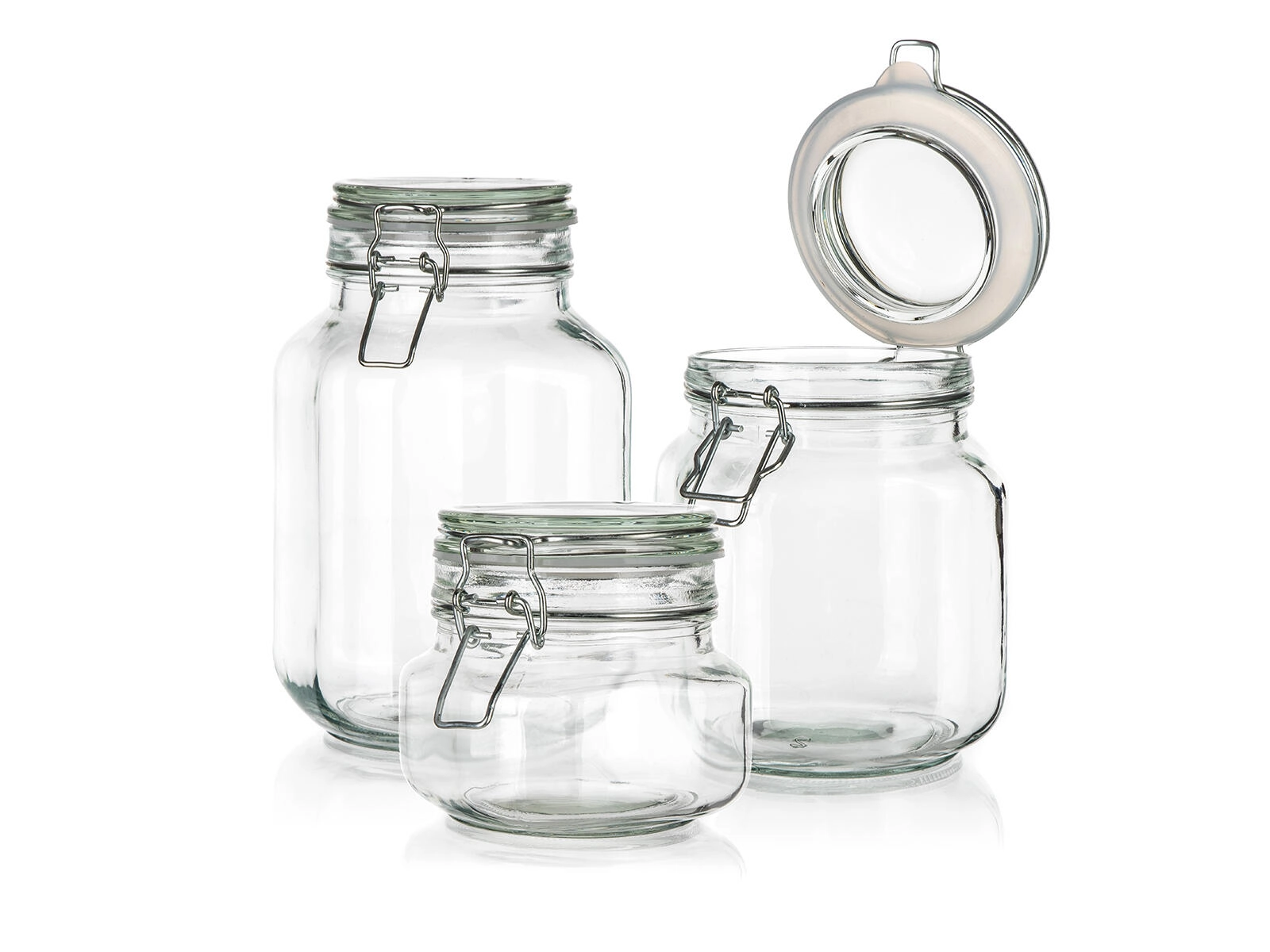 Praktičan set triju staklenih posuda EREA zapremnine 0,5 l, 1 l i 2 l s hermetičkim patentnim zatvaračem za dugotrajnu svježinu. Silikonska brtva osigurava nepropusno zatvaranje, a prozirno staklo pruža trenutan uvid u sadržaj. Idealno za suhe namirnice i ukiseljavanje.